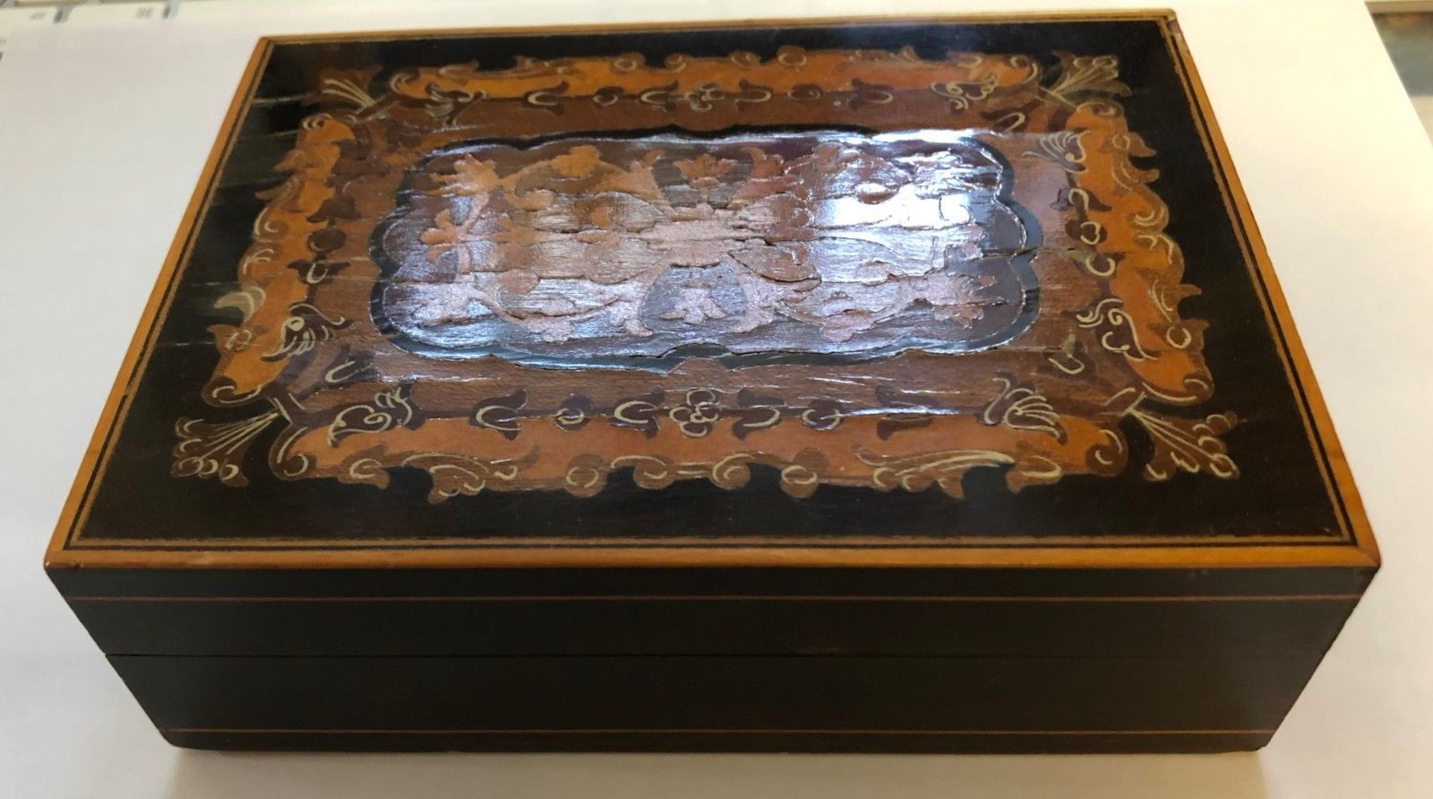 Vintage Wood Box with Intricate Inlay Pattern Design Hinged