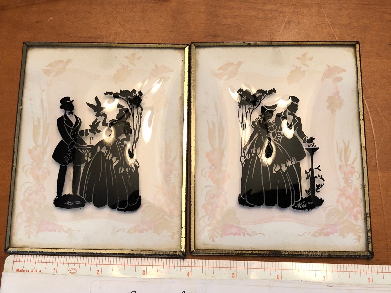 Older Silhouette Pictures curved convex Reverse Painted Glass Antique Victorian