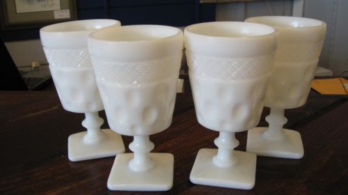 Title (ebay affiliate link): VINTAGE WHITE MILK GLASS McKEE THUMBPRINT & CROSSHATCH WATER GOBLETS