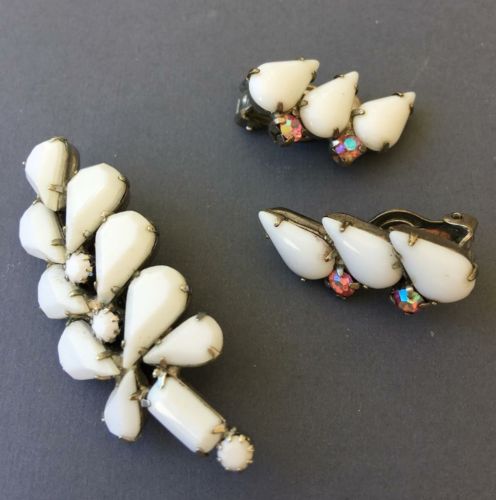 Title (ebay affiliate link): Vintage SET Pin Brooch EARRINGS Flower gorgeous MILK GLASS WHITE Silver tone