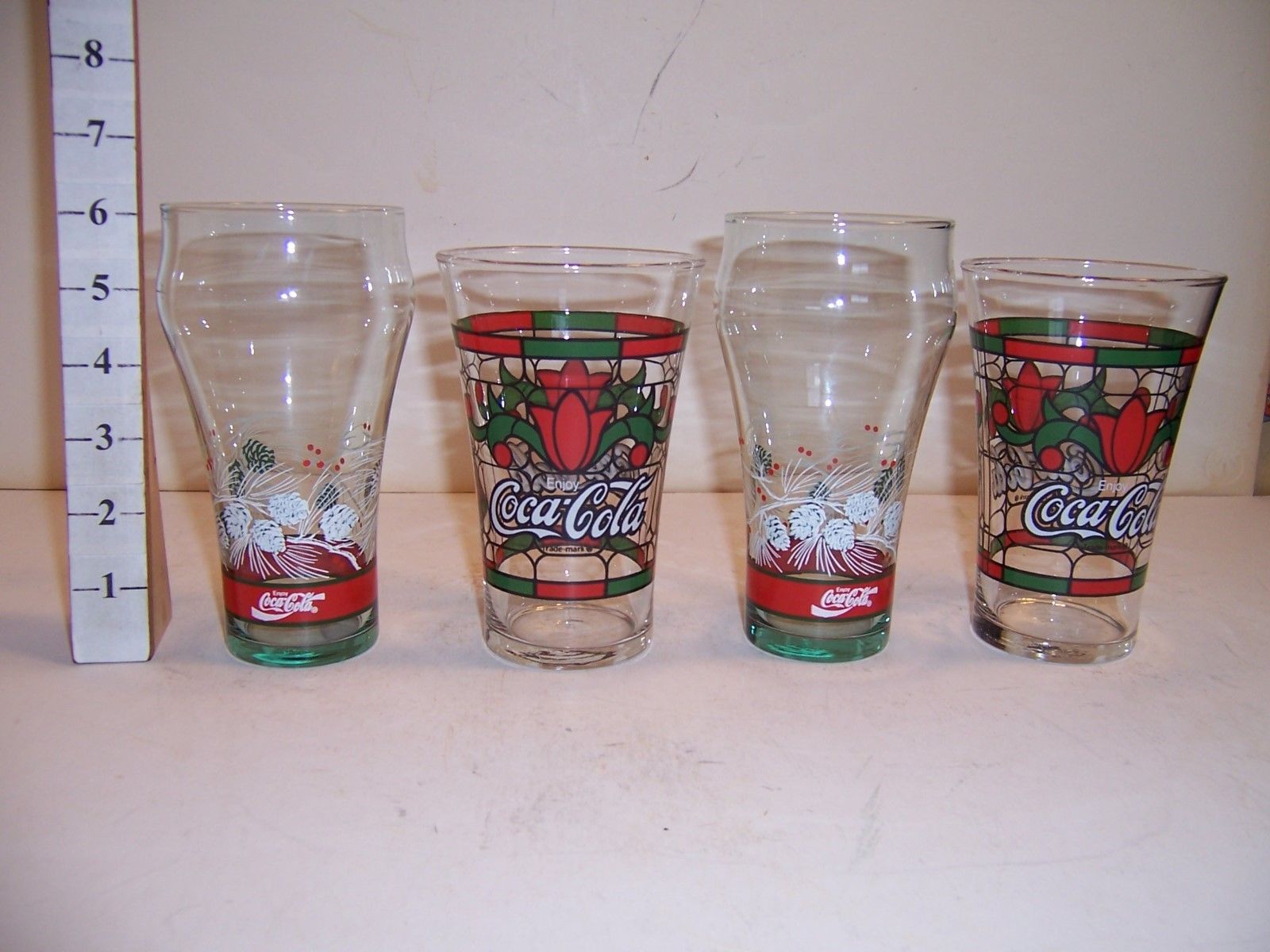 Title (ebay affiliate link): 4 Coca Cola Vintage Collector Glasses Coke 2 Tulip Flare 2 Pine Cone Bell Style