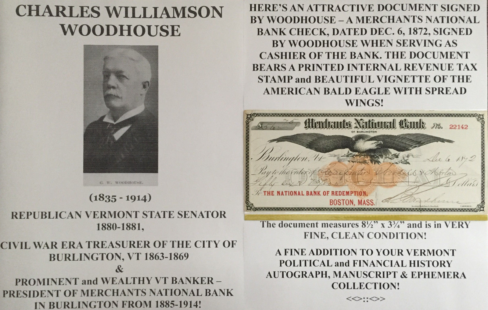 CIVIL WAR TREASURER BURLINGTON VERMONT STATE SENATOR DOCUMENT SIGNED CHECK 1872!