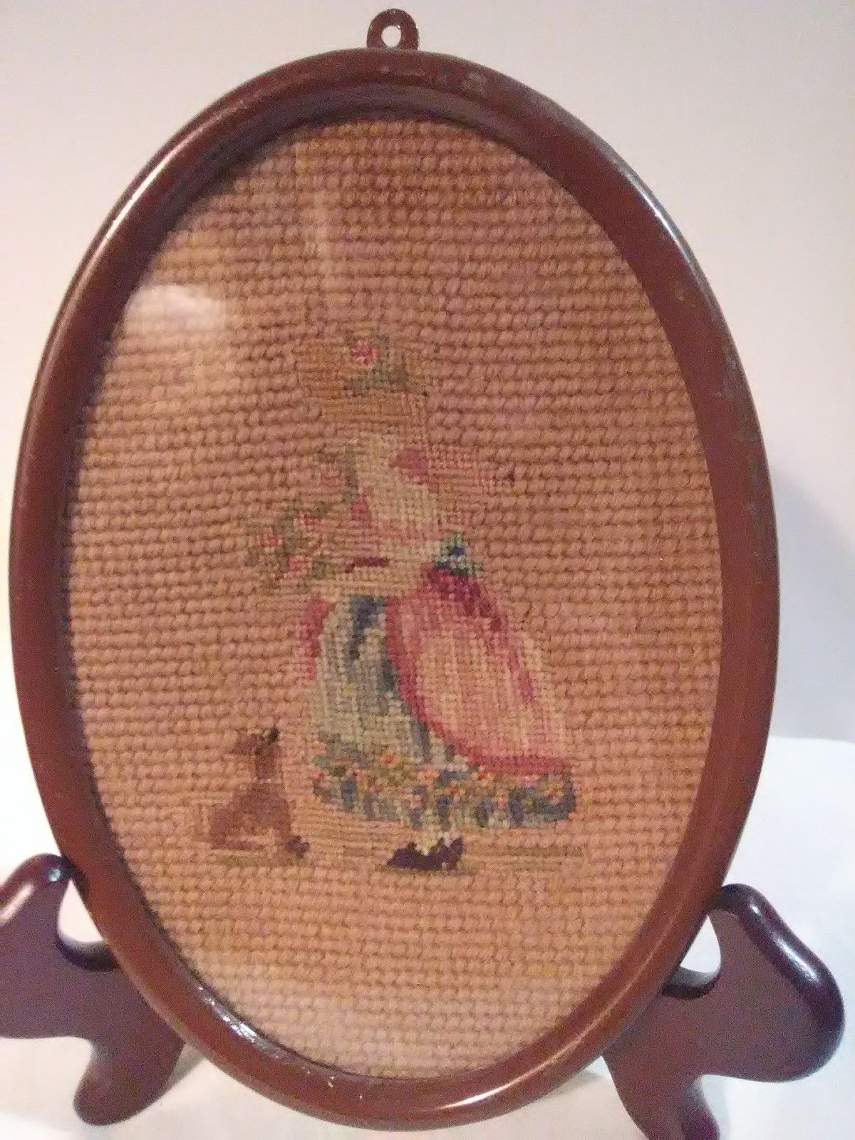 Title (ebay affiliate link): Old Oval Tin Frame Needlepoint Girl and Dog EA Brown Maker Chicago (#124)