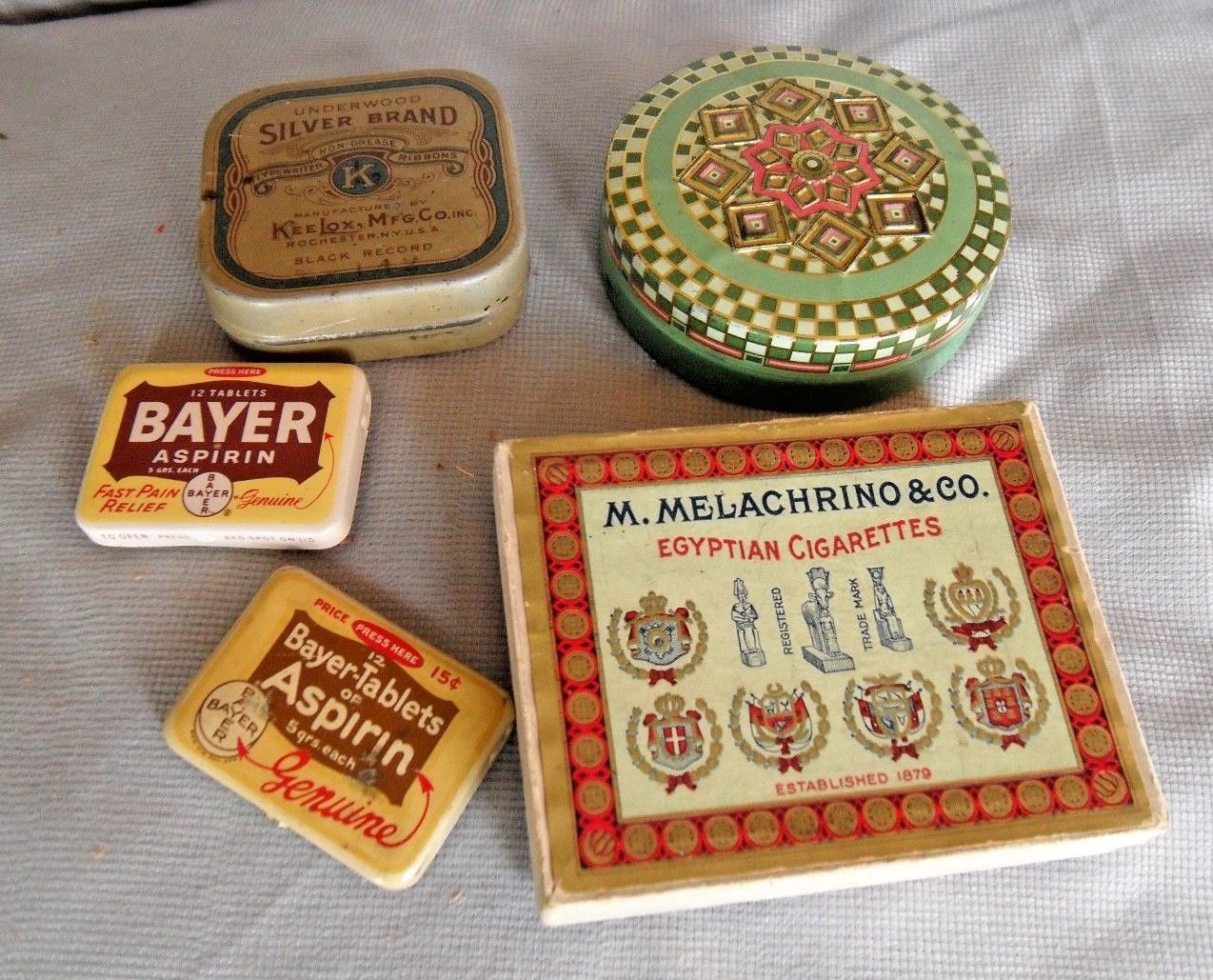 Vintage-Advertising-Aspirin-Typewriter Ribbon-Cigarette Box-Tin-Craft-Lot-of 5