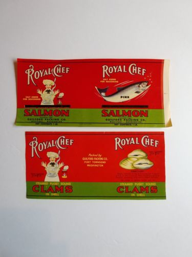 Title (ebay affiliate link): Vintage Tin Can Labels ROYAL CHEF Clams Pink Salmon fish Westport Puget Sound WA
