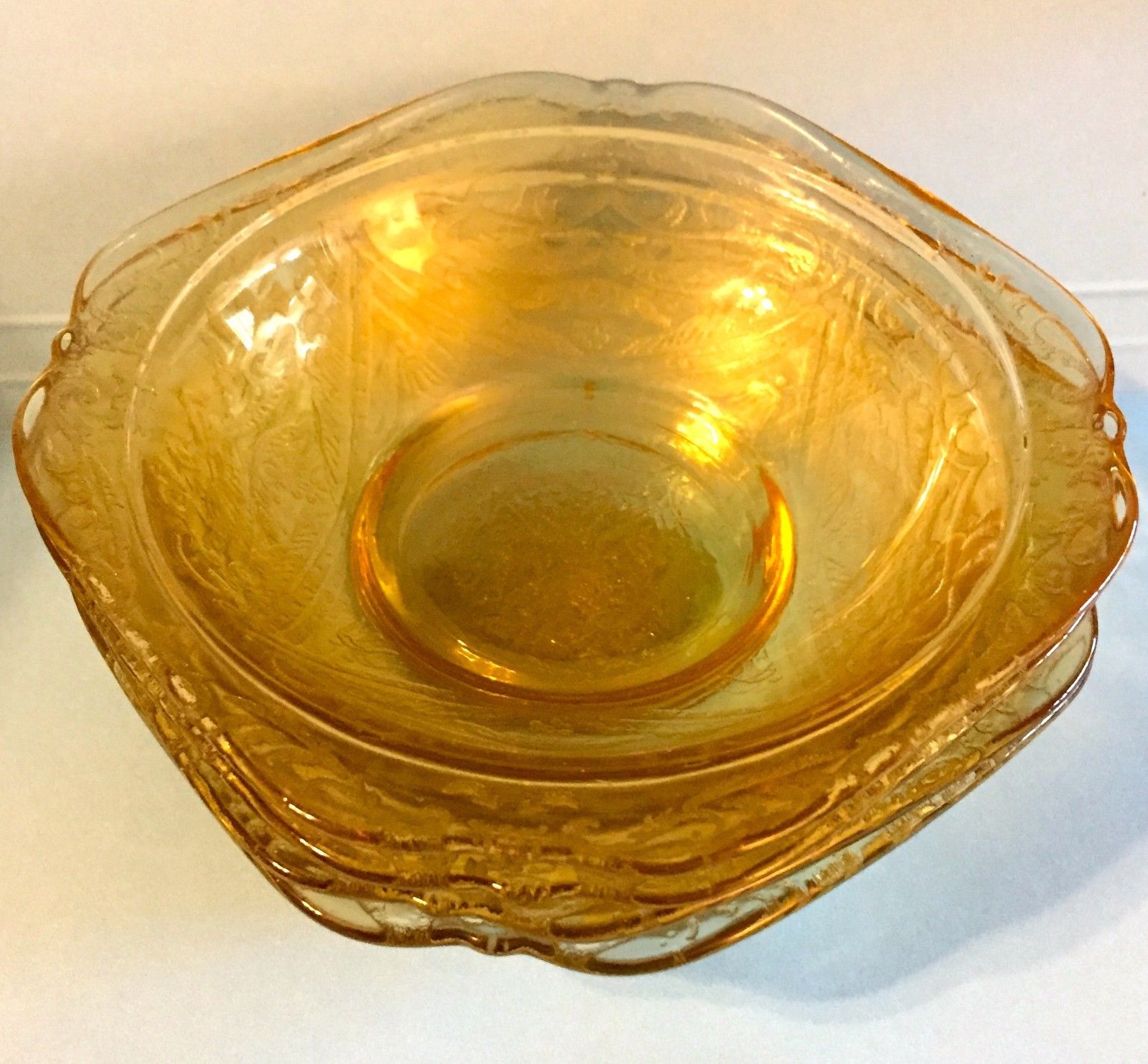 Title (ebay affiliate link): Four (4) Federal Madrid Amber yellow depression glass 5" inch Sauce bowl dish