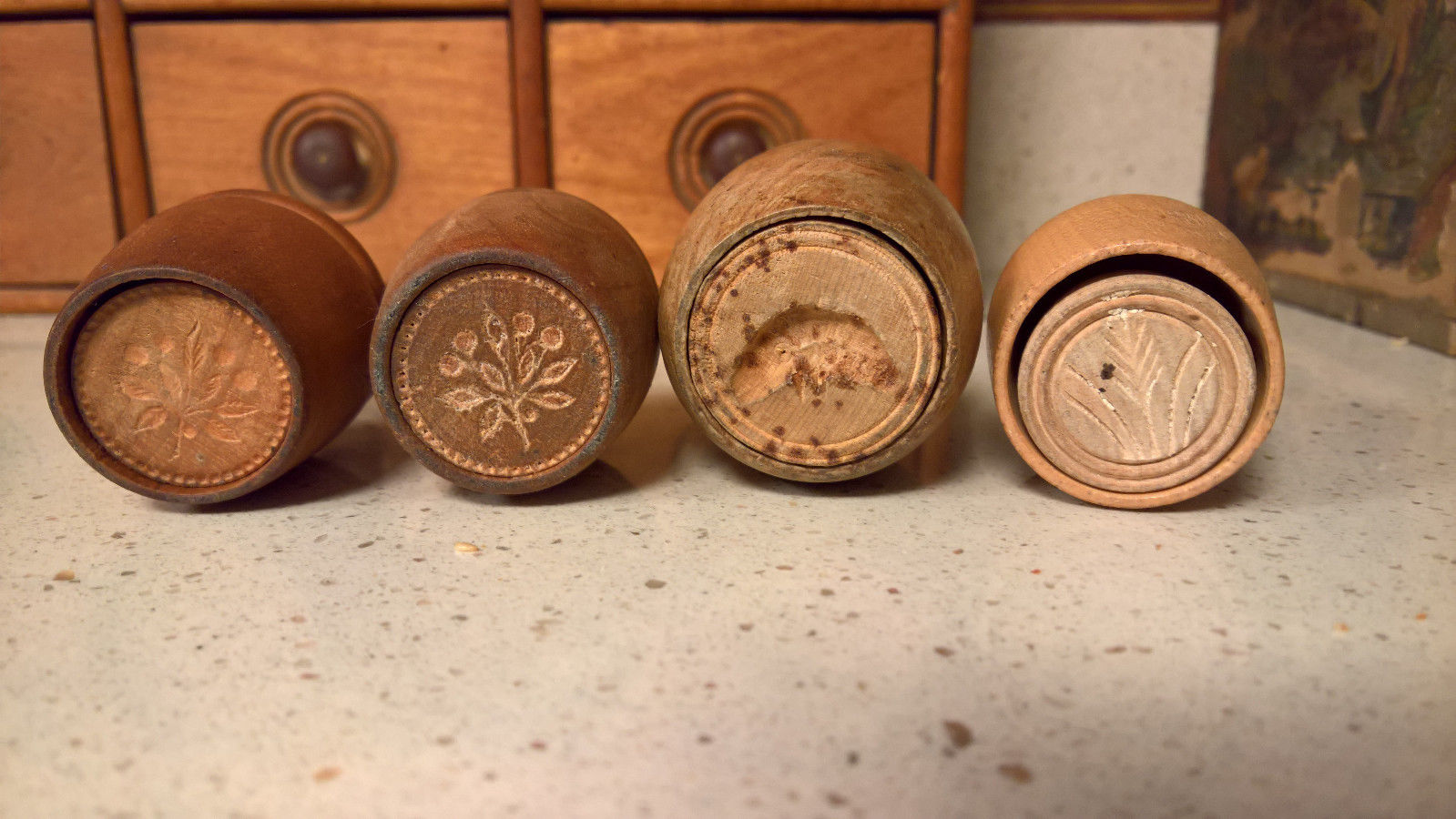 Title (ebay affiliate link): PRIMITIVE VINTAGE WOOD SMALL BUTTER MOLD STAMP PRESS LOT OF 4