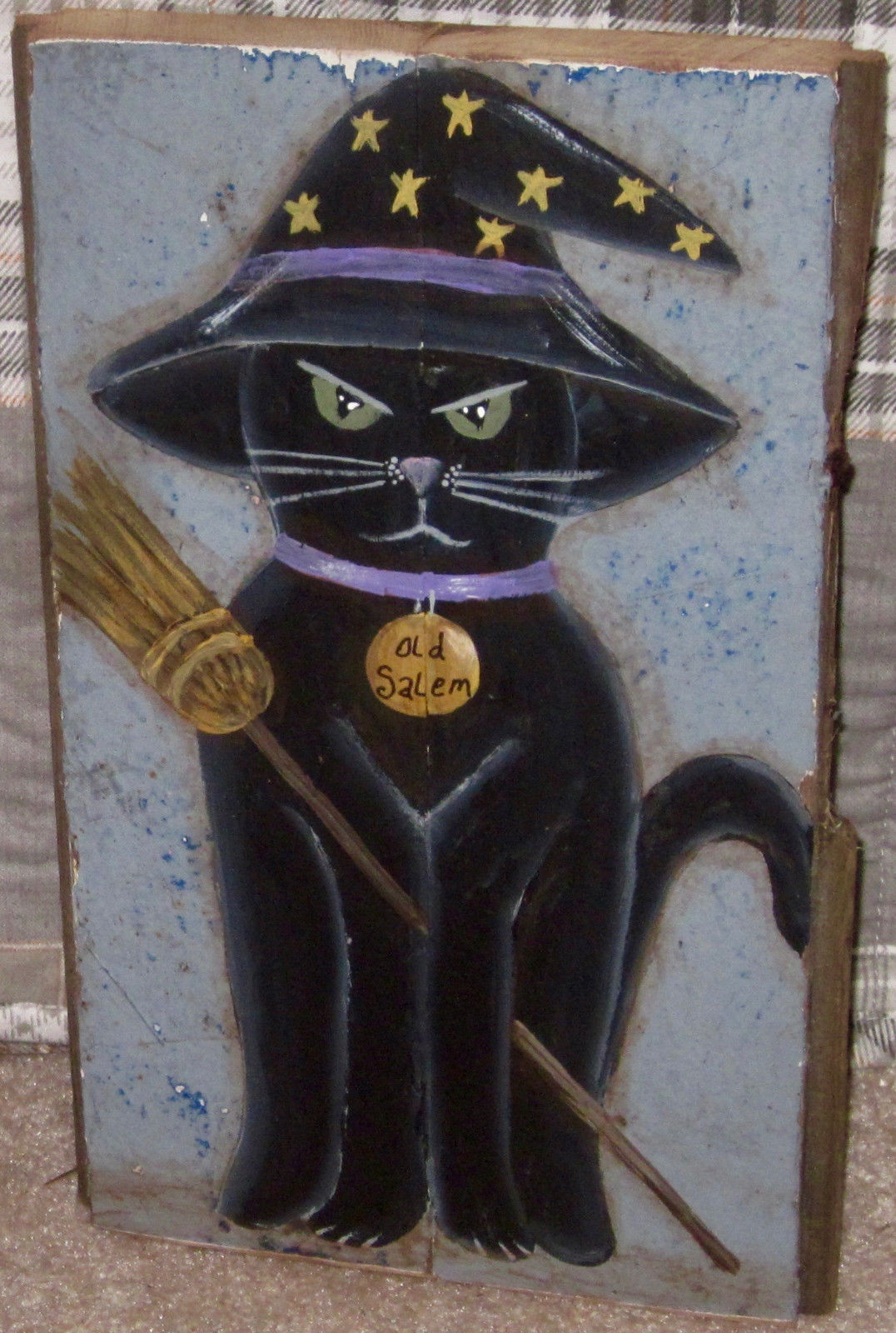 Title (ebay affiliate link): *~*PRIMITIVE*~* HP FOLK ART PRIM BLACK CAT WITCH *~* OLD RECLAIMED WOOD