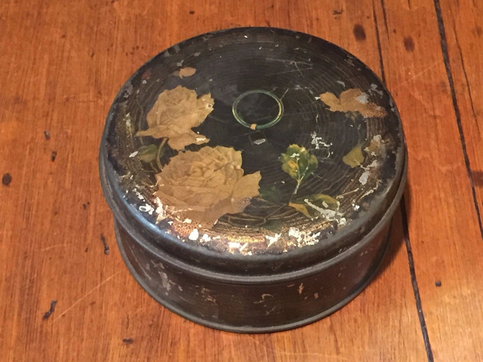 Title (ebay affiliate link): Antique Vintage Tindeco Candy Tin Lithographed Wicker Basket with Flowers