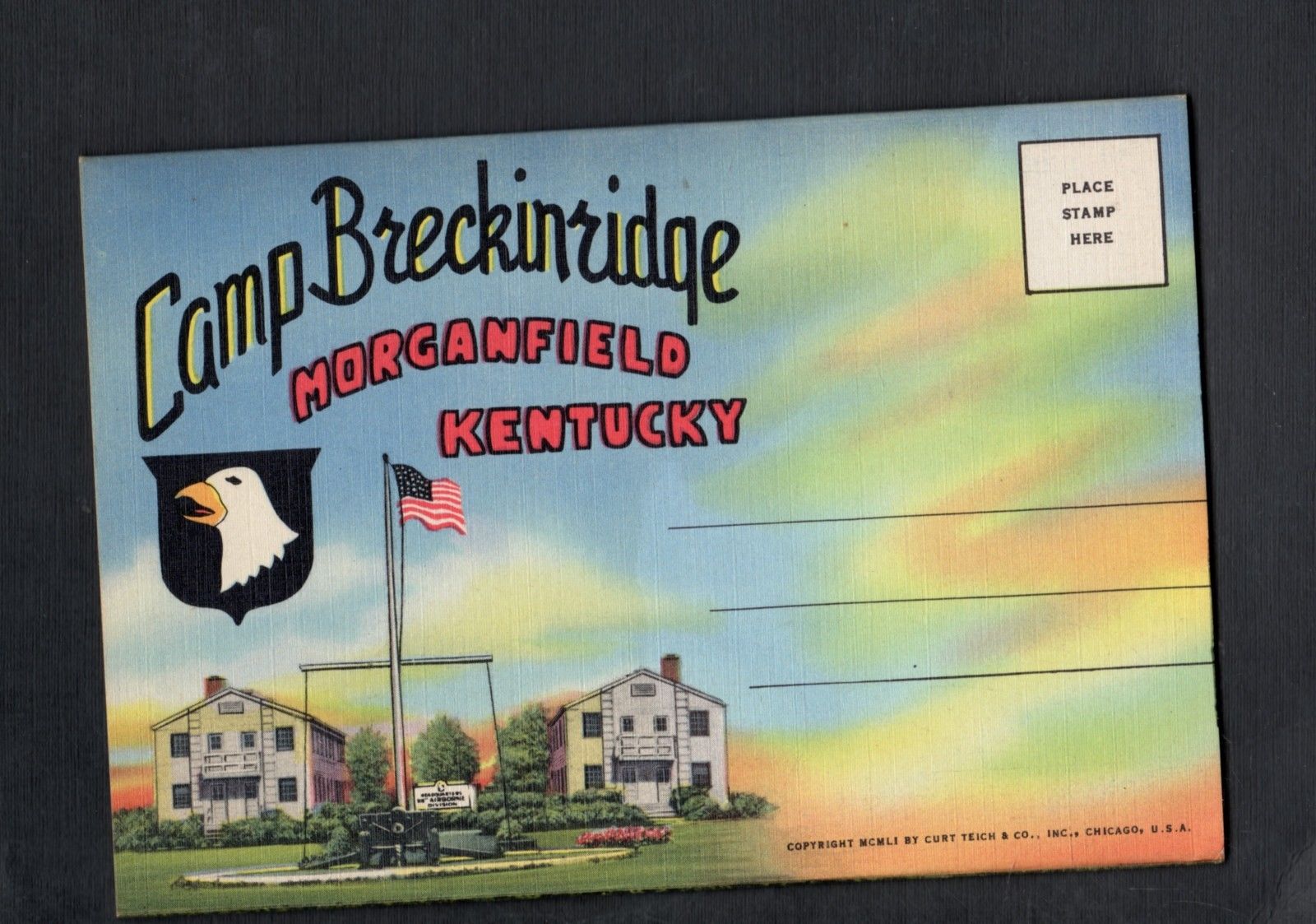 Title (ebay affiliate link): E901 Linen folder postcard Camp Breckinridge Morganfield KY Military