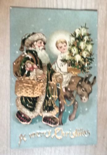 Title (ebay affiliate link): Antique embossed Santa Claus green suit postcard.