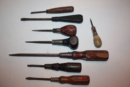 Title (ebay affiliate link): Vintage Lot of 6 Wood Handled Flat Tip Screwdrivers and 2 Awls
