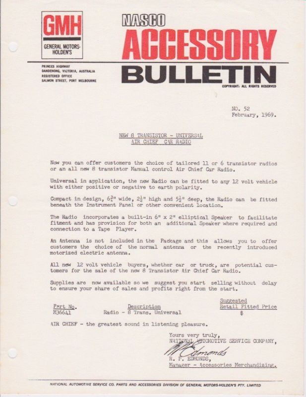 Holden HKTG Nasco Accessories Brochure Air Chief Car Radio