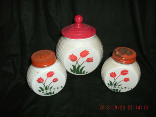 ANTIQUE VINTAGE MILK GLASS VITROCK RED WHITE GREASE JAR SALT PEPPER WITH TULIPS