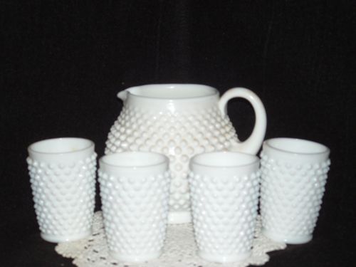 Title (ebay affiliate link): Fenton hobnail white Milkglass Pitcher with 4 hobnail water glasses