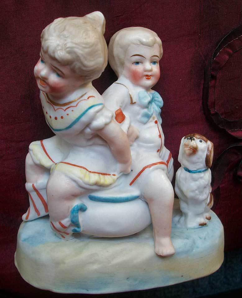 Title (ebay affiliate link): 1920s German bisque figurine Small boy &Girl on Chamber Pot w Onlooking Dog
