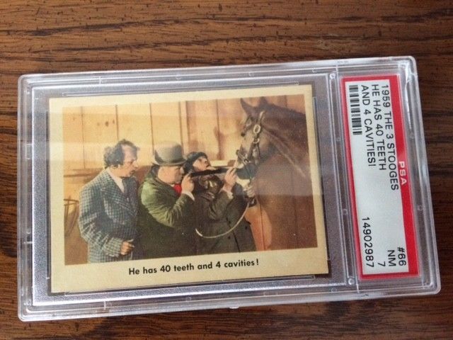 Title (ebay affiliate link): 1959 Fleer The 3 Stooges HE HAS 40 TEETH AND 4 CAVITIES! # 66 PSA 7 NM (LOOK)