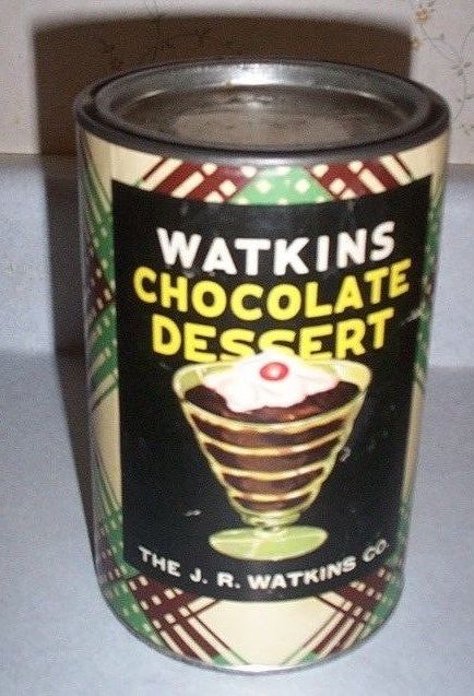 Title (ebay affiliate link): VINTAGE VERY GOOD J.R. WATKINS CARDBOARD TIN, WATKINS CHOCOLATE DESSERT, RECIPE
