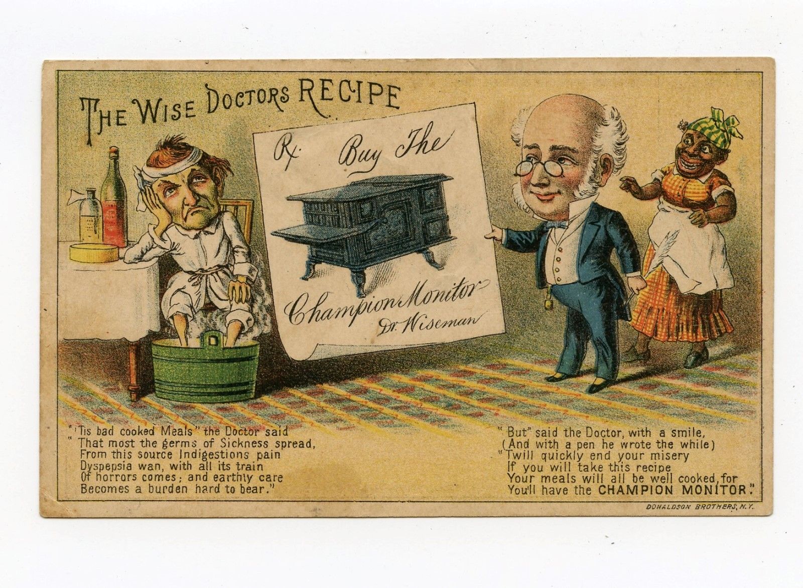 1880''S STOVE VICTORIAN TRADE CARD DOCTOR''S RECIPE POEM QUACK MEDICINE
