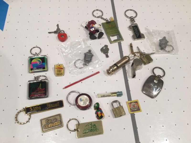 Title (ebay affiliate link): JUNK DRAWER LOT OF VINTAGE KEYCHAINS, Whistles Button Hawaii Locks Etc