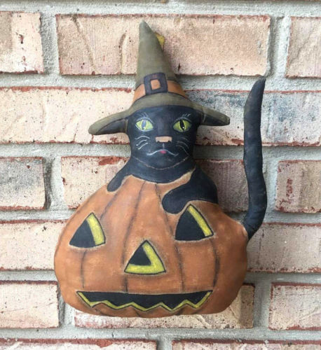 Title (ebay affiliate link): PRIMITIVE FOLK ART HALLOWEEN FALL VINTAGE CAT WITCH DOLL ON JACK-O-LANTERN