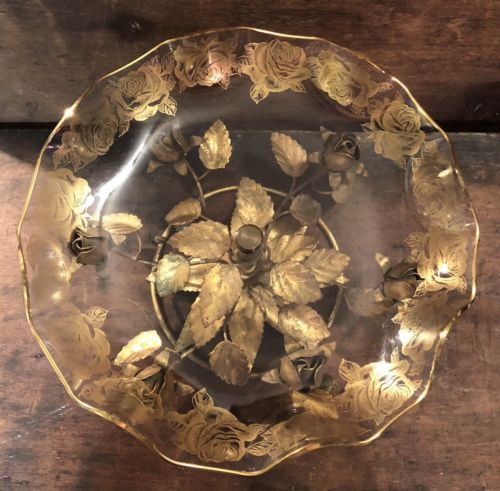 Title (ebay affiliate link): Vintage Gold Gilt Metal Roses with Glass Fruit Bowl/Dish Compote Made in Italy