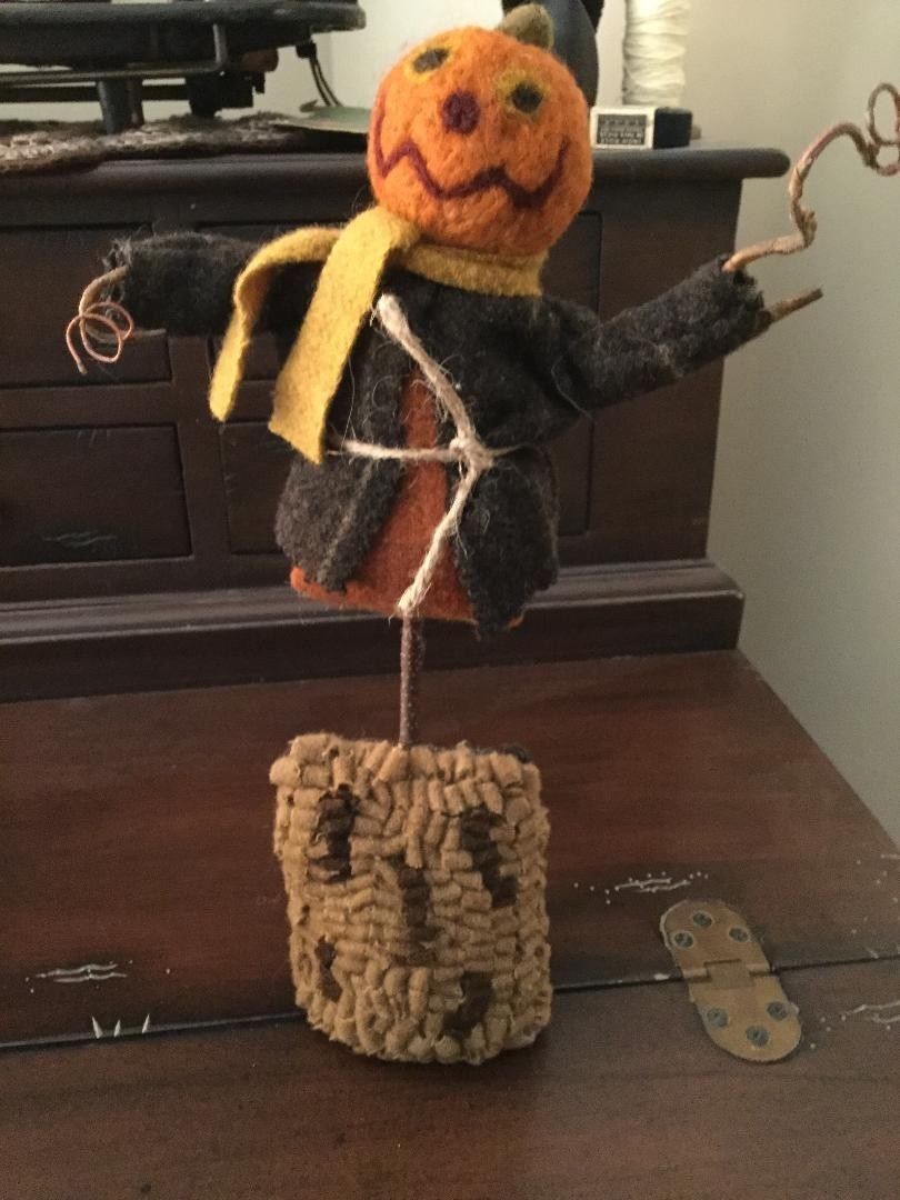 Title (ebay affiliate link): PRIMITIVE FOLK ART WOOL PUMPKIN SCARECROW ON HOOKED WOOL BASE