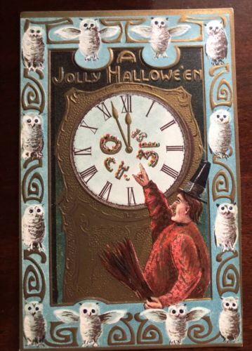 Title (ebay affiliate link): Antique Halloween Witch Owls & Clock Germany Embossed Postcard.