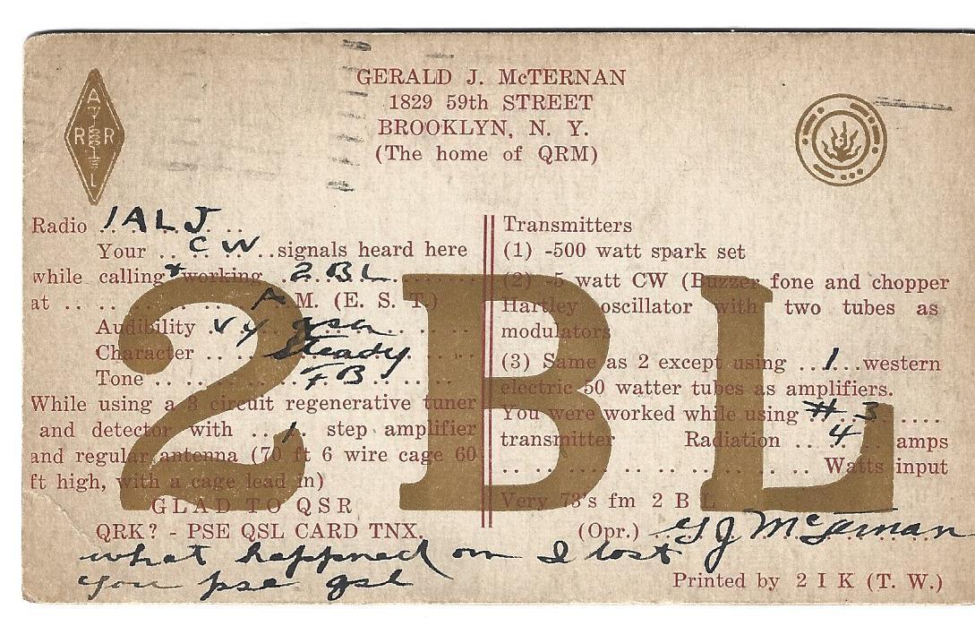 QSL 1924 Brooklyn NY 2BL radio card