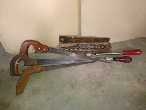 OLD wooden VINTAGE TOOLS saws drill bits woodworking screw driver
