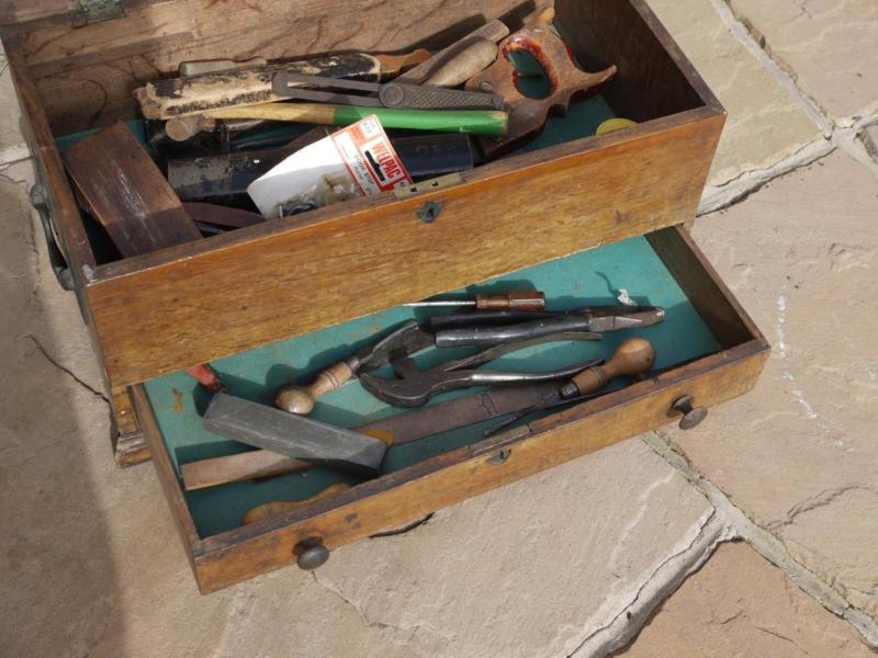 Title (ebay affiliate link): HEAVY STURDY ANTIQUE WOODEN STORAGE CHEST/BOX WITH DRAWER & VINTAGE TOOLS