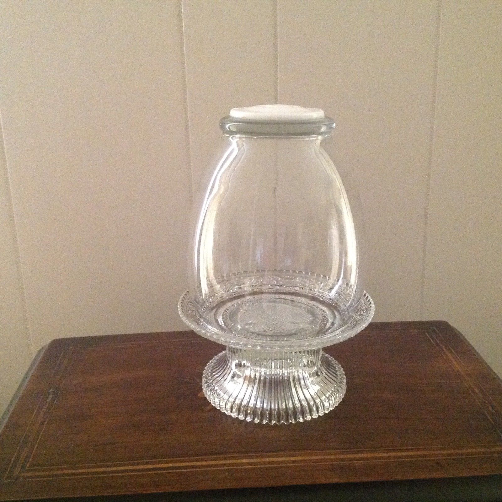 Title (ebay affiliate link): Vintage Glass Cloche with Pedestal and Milk Glass Top.9" tall x6" "Very Old"