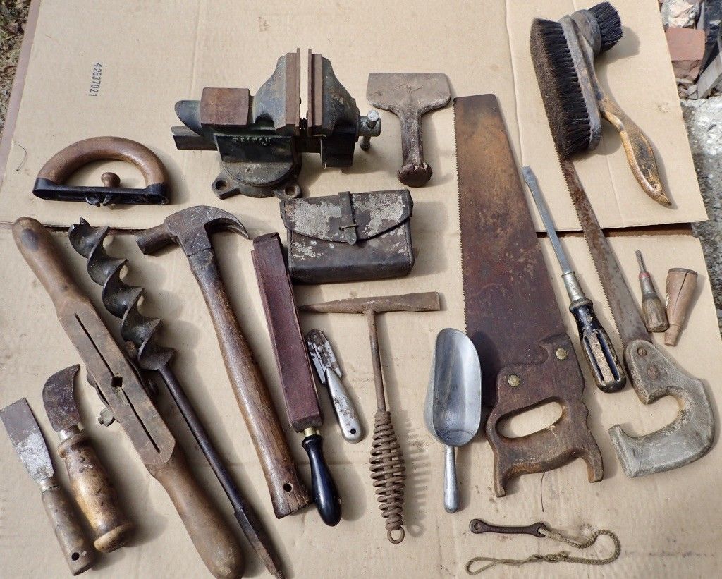 Title (ebay affiliate link): big lot of vintage & antique rusty barn tools hammer auger vise saws strap scoop