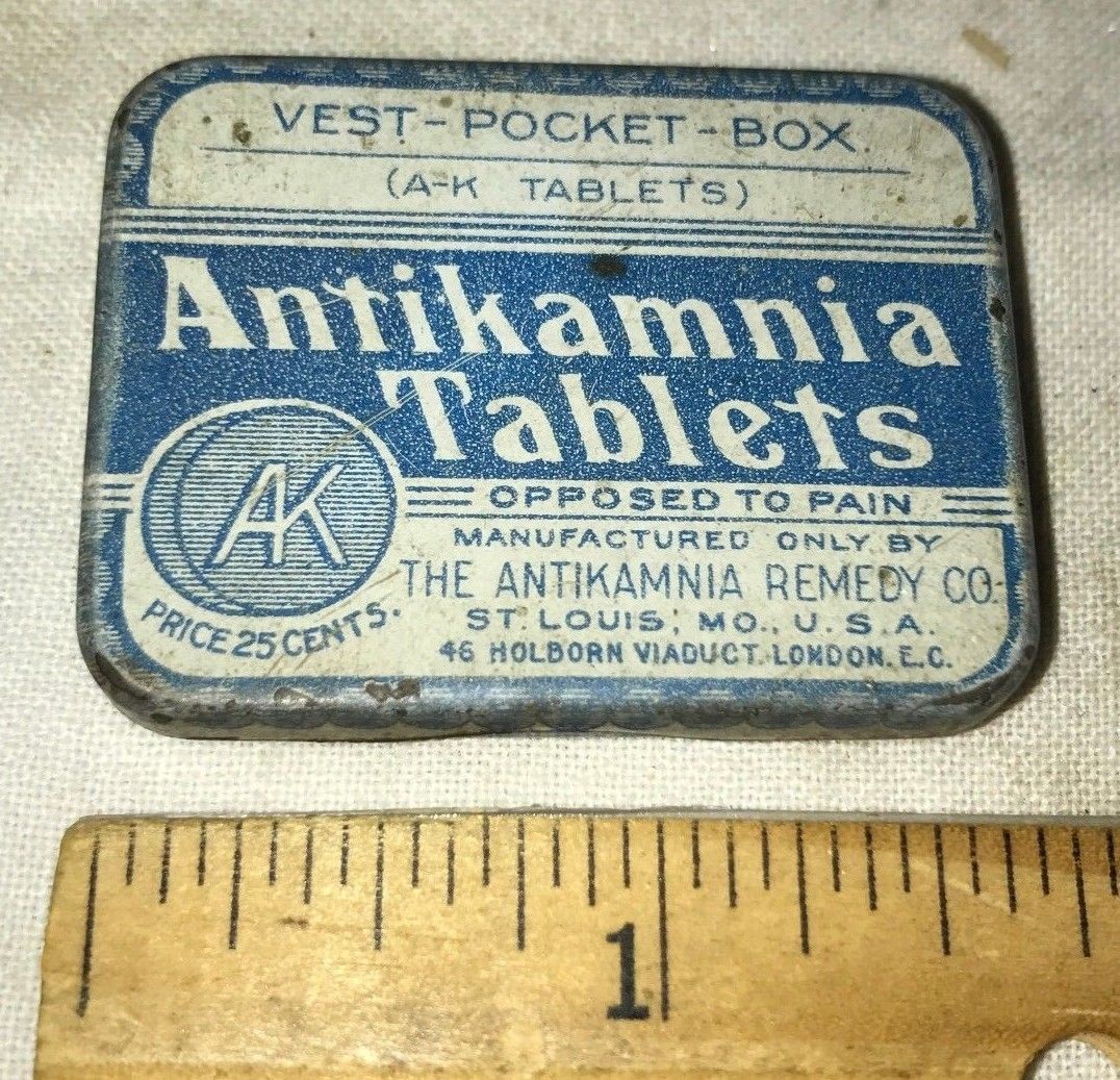 Title (ebay affiliate link): ANTIQUE ANTIKAMNIA TABLET MEDICINE TIN LITHO CAN ST LOUIS MO REMEDY DRUG ASPIRIN