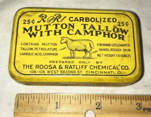 Title (ebay affiliate link): ANTIQUE R&R ROOSA RATLIFF MUTTON TALLOW TIN LITHO SKIN MEDICINE CAN CINCINNATI O