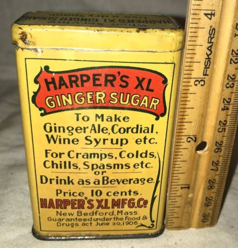 Title (ebay affiliate link): ANTIQUE HARPERS XL GINGER SUGAR COLD CRAMP MEDICINE TIN LITHO CAN NEW BEDFORD MA