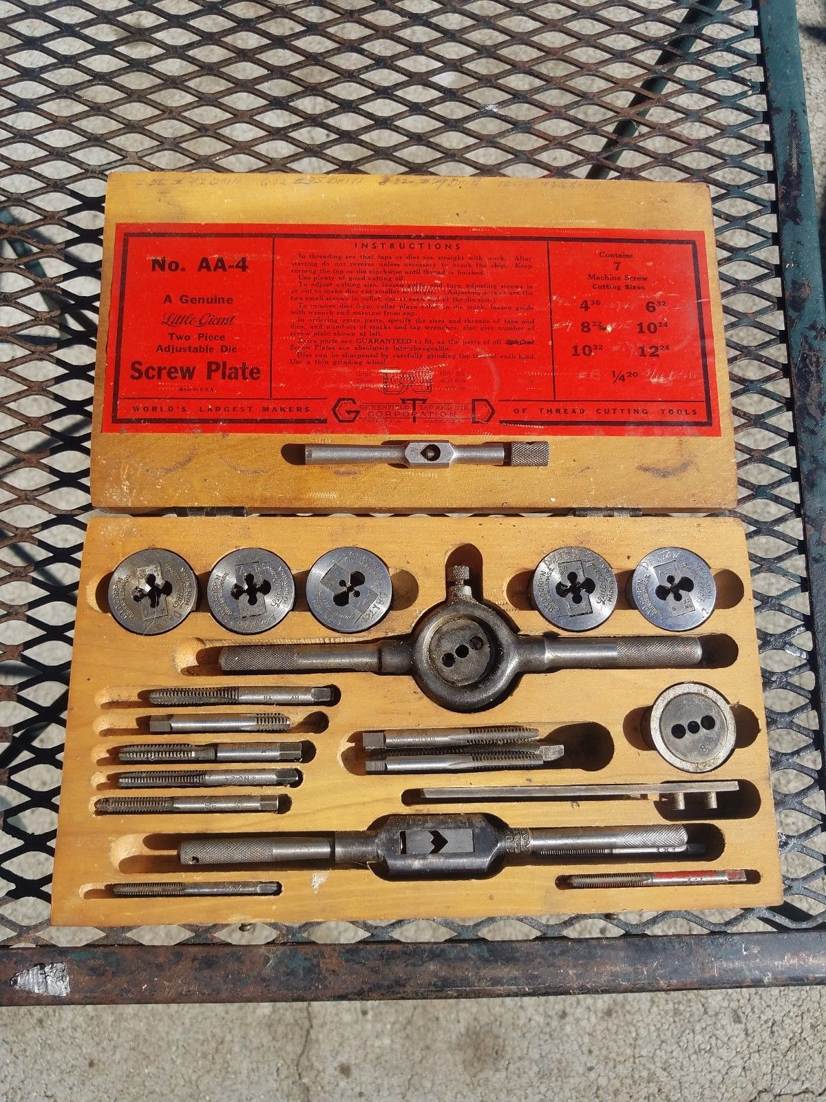 Title (ebay affiliate link): Greenfield GTD Little Giant Screw Plate Tap & Die Set No. AA4 Xtras 24pcs Total