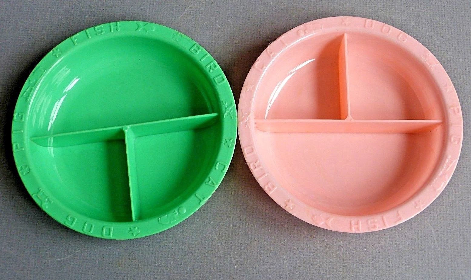 Title (ebay affiliate link): Vintage Amsco Doll E Toys 2 Divided Animal Dishes Pink Green Spelling Alphabet