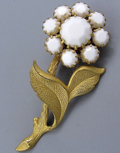 Title (ebay affiliate link): Vintage Jewelry Faceted White Milk Glass Flower BROOCH PIN Rhinestone Lot H