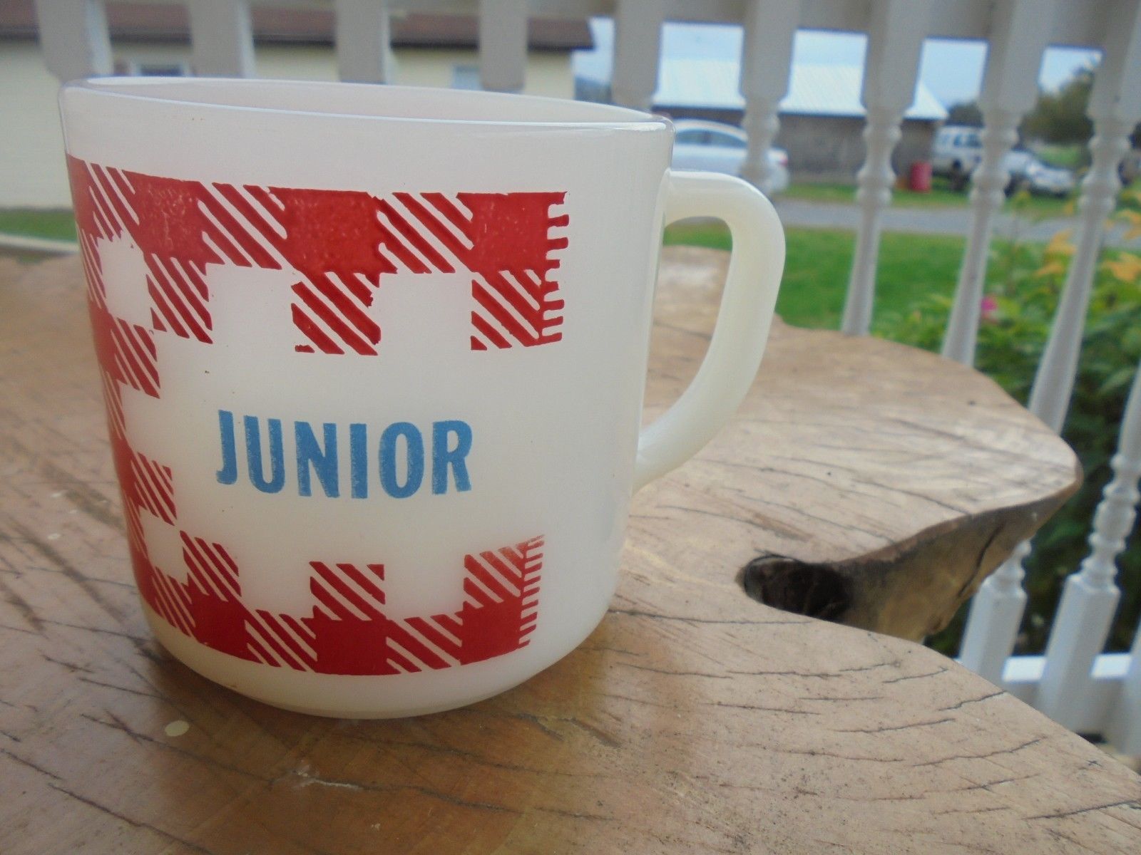 Federal white milk glass coffee cup mug JUNIOR red plaid checkered Gingham Vtg
