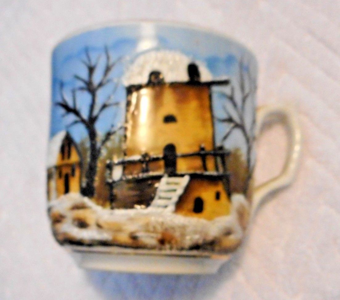 Antique Victorian Hand Painted German Winter Farm Bldg Scene Cup