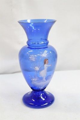 Vintage Mary Gregory Blue White Painted Trees Little Girl Glass Vase