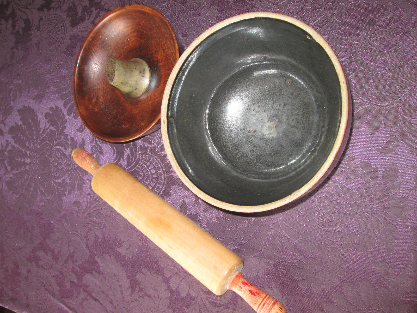 3pc. Vintage Farmhouse Kitchen lot, brownware, rolling pin, nut bowl