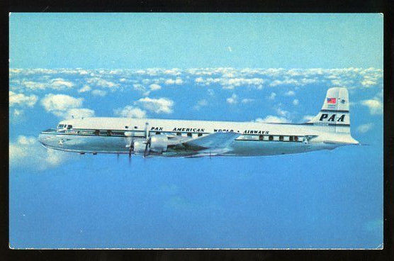 Title (ebay affiliate link): 1954 postcard w multilingual captions, Pan Am Super-6 Clipper airplane in flight