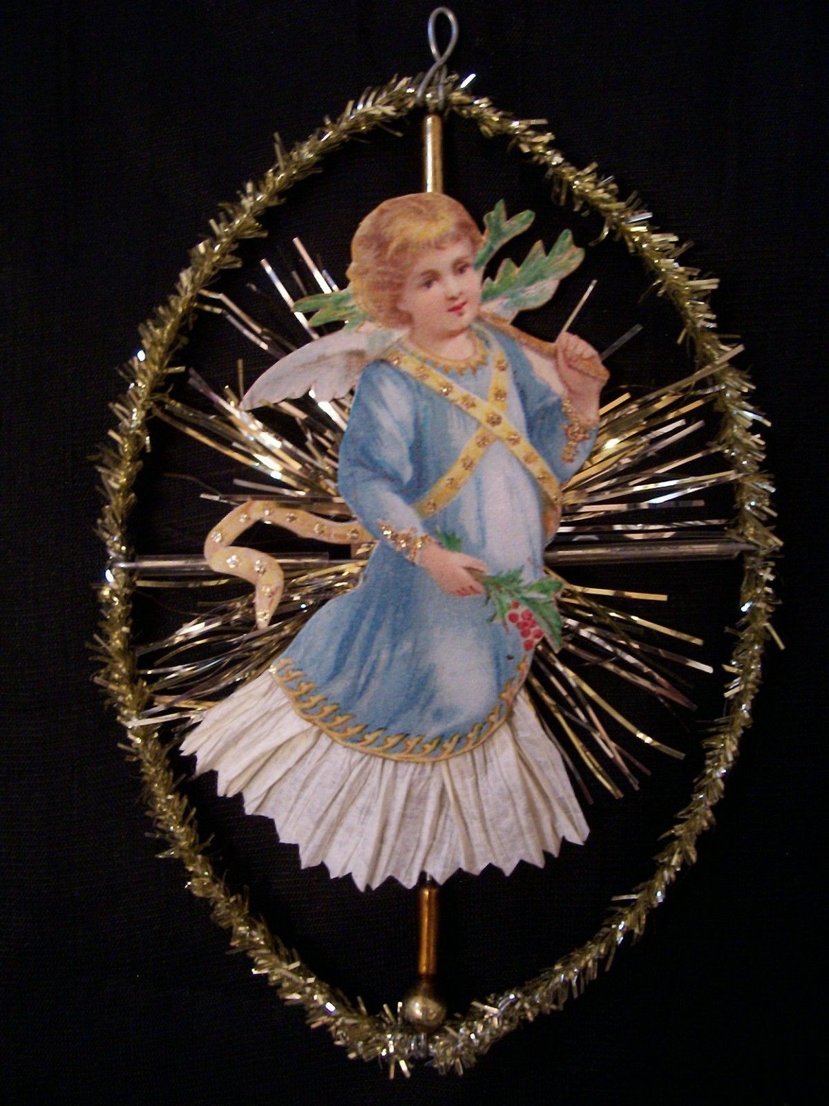 Antique Look Christmas Ornament, Angel in Blue, Glass, Scrap, Tinsel, Hand Made