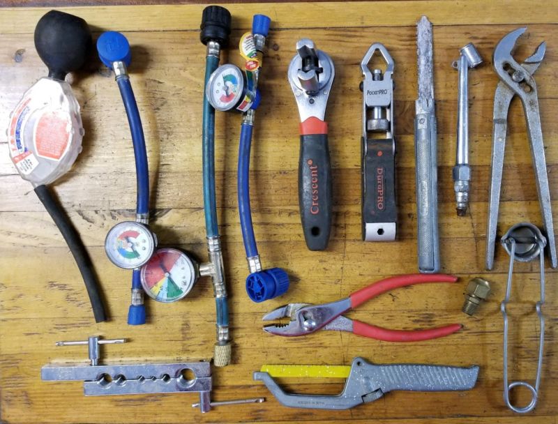 Title (ebay affiliate link): MECHANICS Plumbers Mixed Tools Lot Gauges Pliers Crimpers Inflators Compression