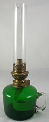 Stunning Antique Green Glass Carry Oil Lamp With Glass Chimney
