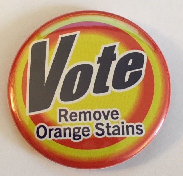 Title (ebay affiliate link): 2 1/4" Anti-Trump Vote - Remove Orange Stains Political Pin