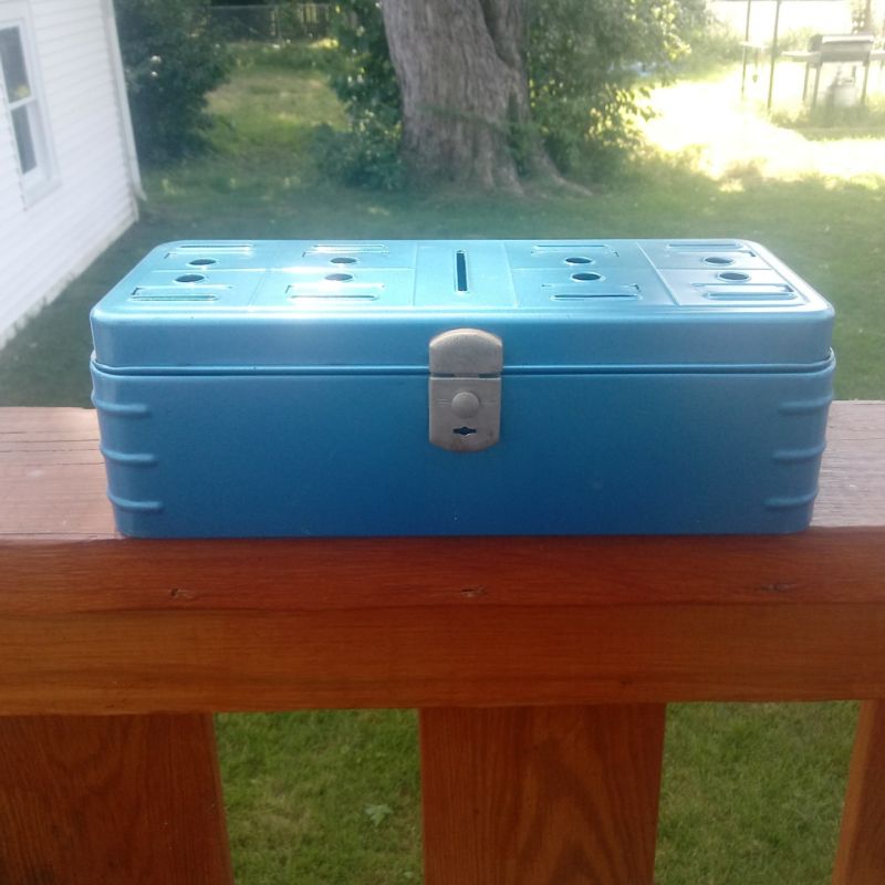 Title (ebay affiliate link): Rare Vintage Climax Blue Metal Coin Bank, Savings Bank, Tool Box,