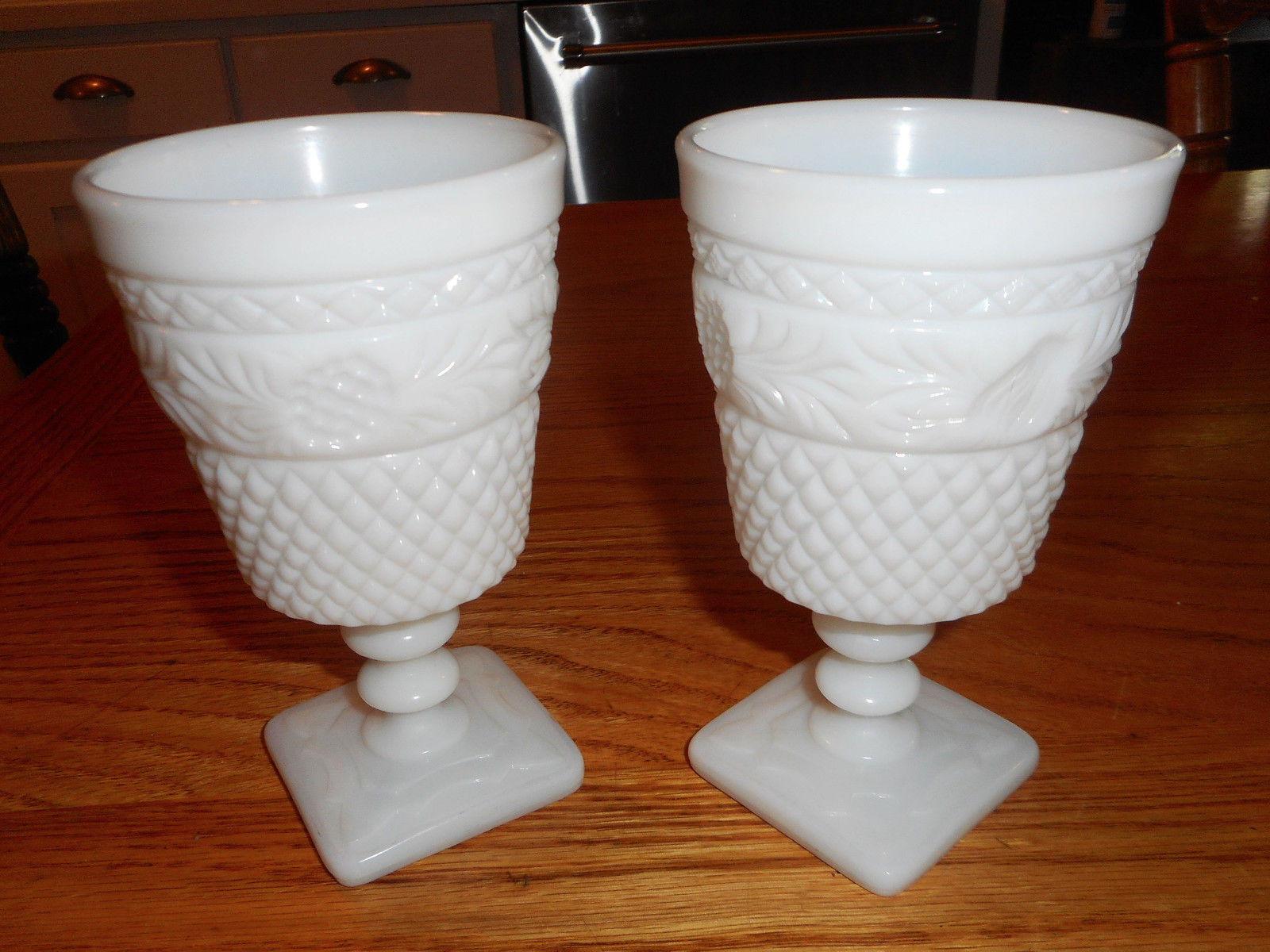 Title (ebay affiliate link): 2 Old Rare White Milk Glass Stem Water Goblets Square Base Quilted Fruit ?